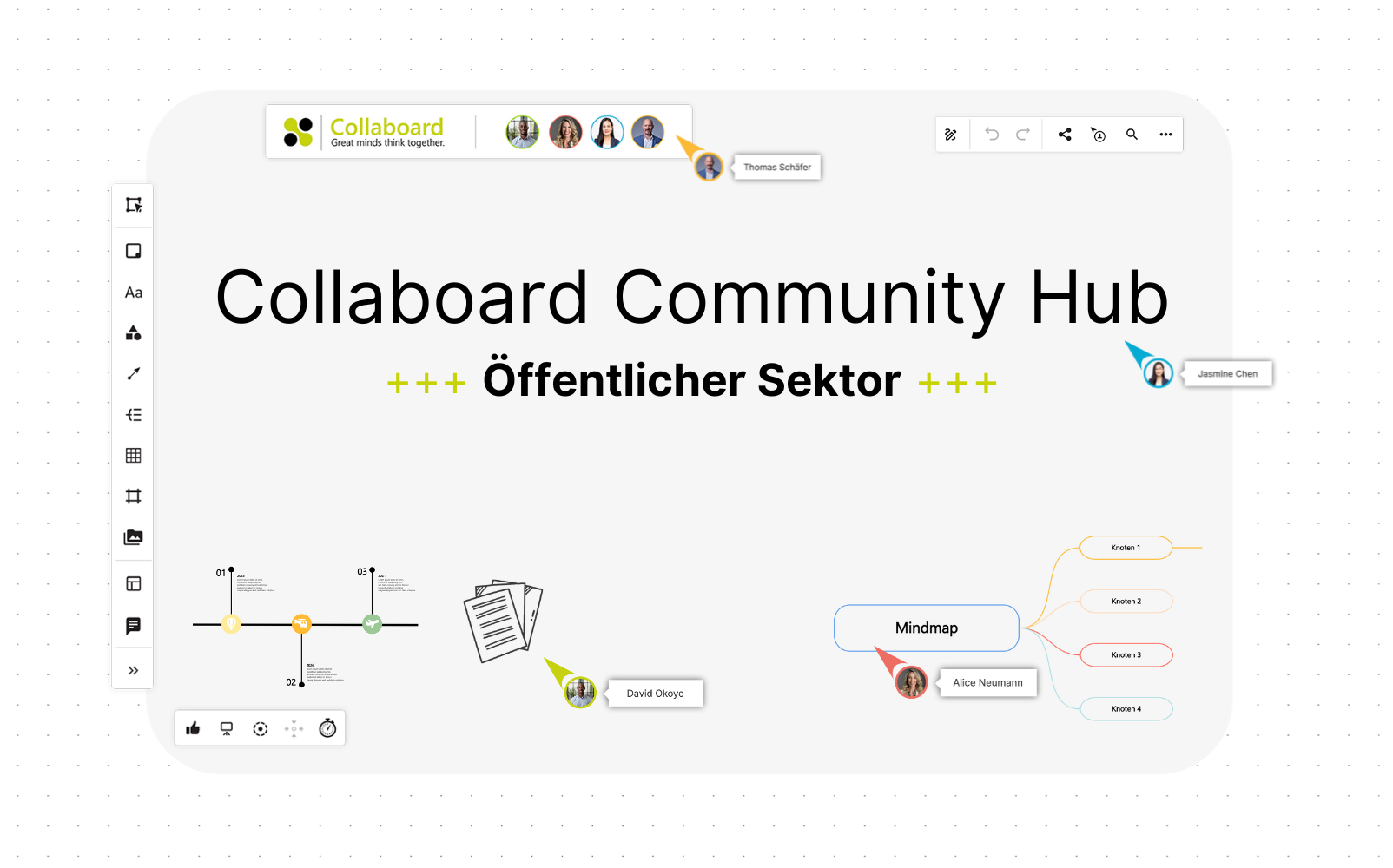 Dieses Event richtet sich an alle aus Behörden, Finanzwesen, Krankenkassen und der Erwachsenenbildung in der Verwaltung, die sich vernetzen, austauschen und inspirieren lassen möchten – egal, ob du bereits Collaboard nutzt oder einfach neugierig bist!
